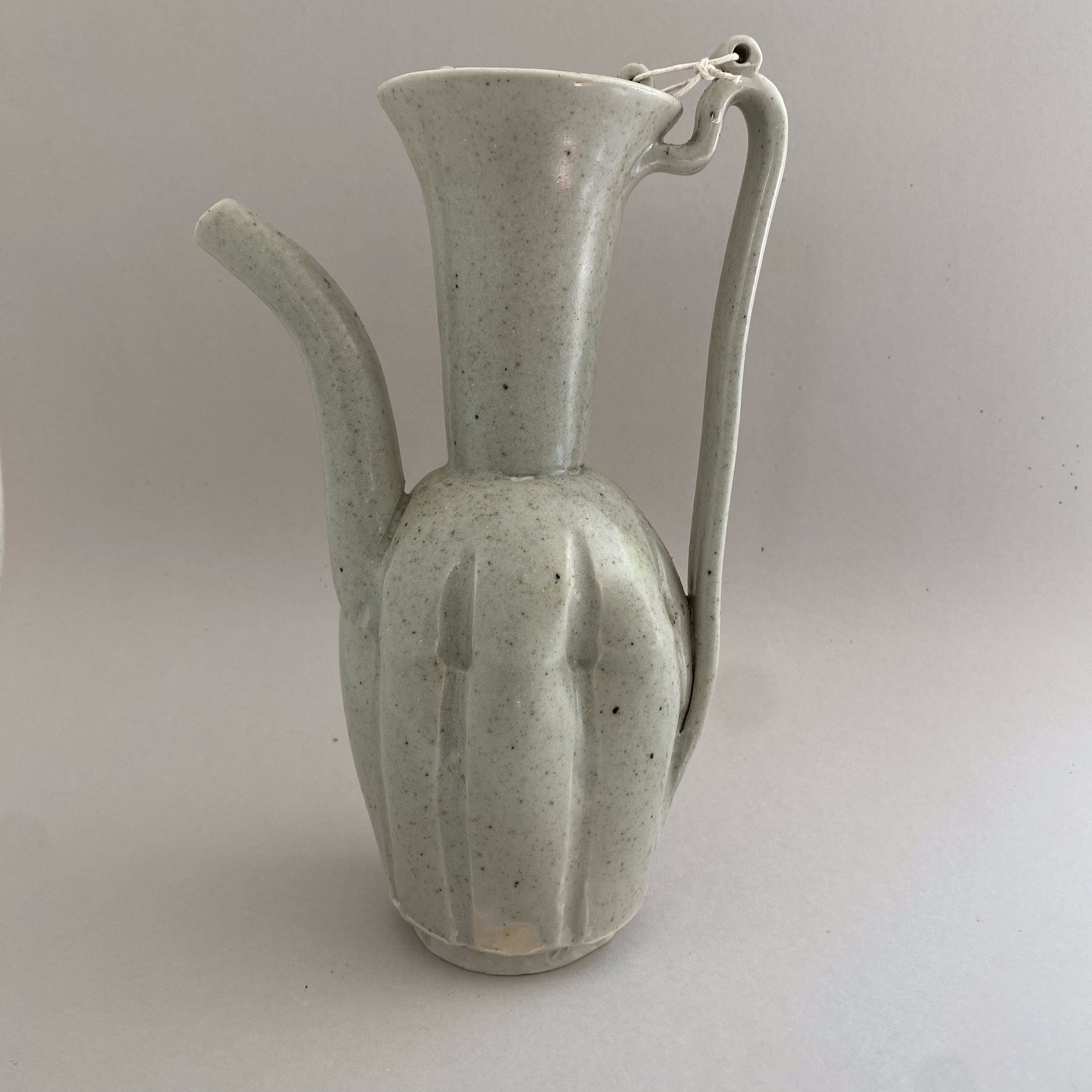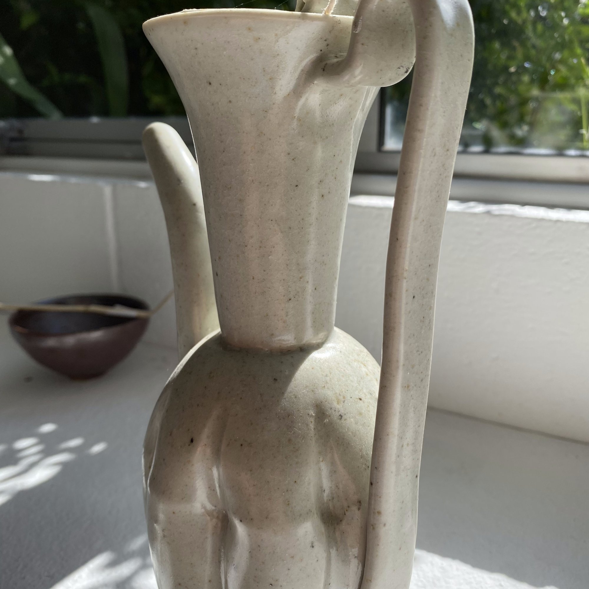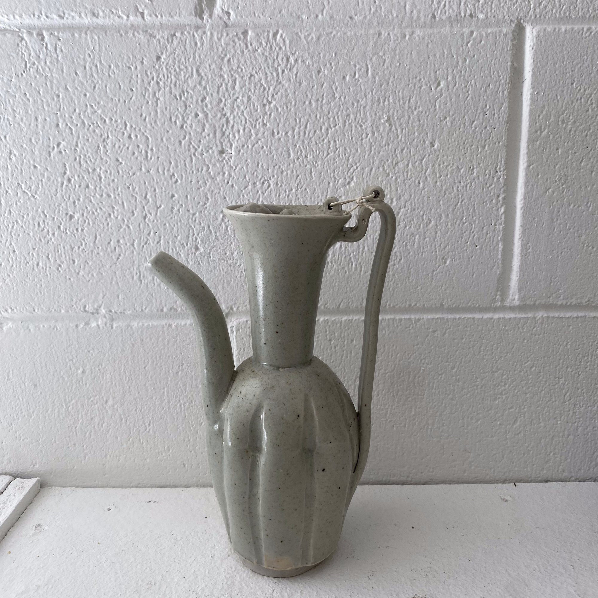 A tall pouring vessel by Jack Tilson, with a lifted neck, long spout, and drawn handle that reads almost as a single line in space.