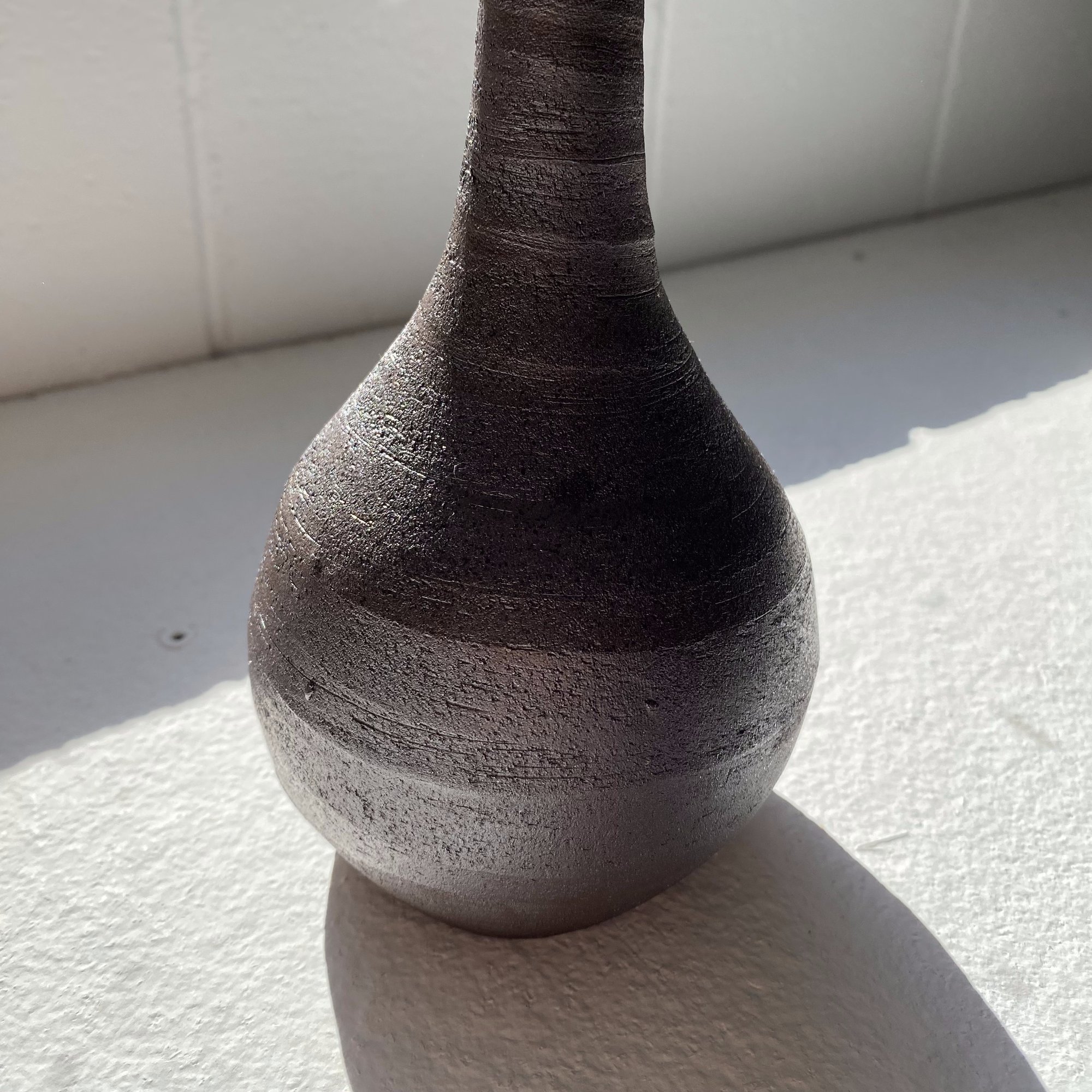 Fired in a wood kiln, the surface carries fine ash and flame marks that move gently across the form.